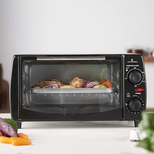 The MisterChef Mini Oven is a multi-purpose appliance with a large 10 litre capacity. It can be adjusted in several ways to cook a wide variety of food. There's a temperature dial which ranges from 100 to 250 degrees Celsius, two shelving heights for varying levels of heat intensity and a 30 minute timer which switches the oven off when it reaches zero and sounds a bell alert. The appliance comes with several accessories - an aluminium baking tray, a chrome wire rack and a handle. There's also a free colour recipe book included.